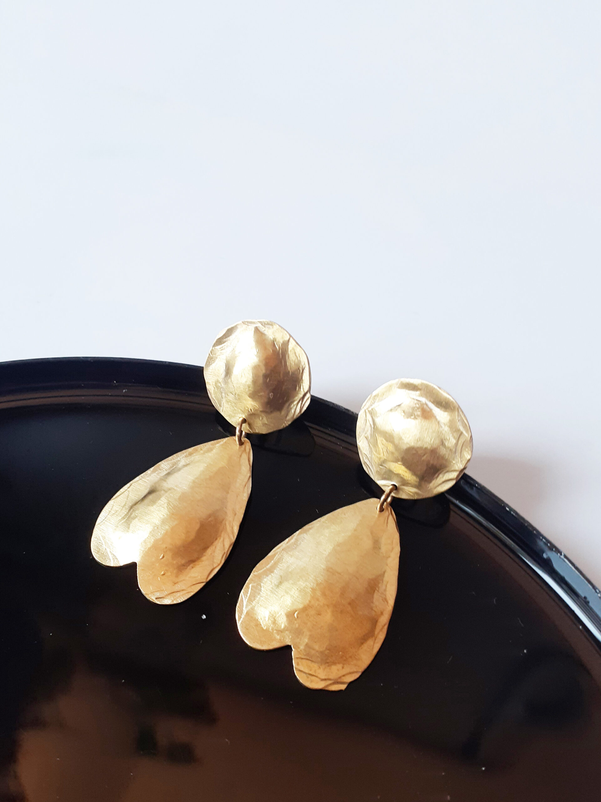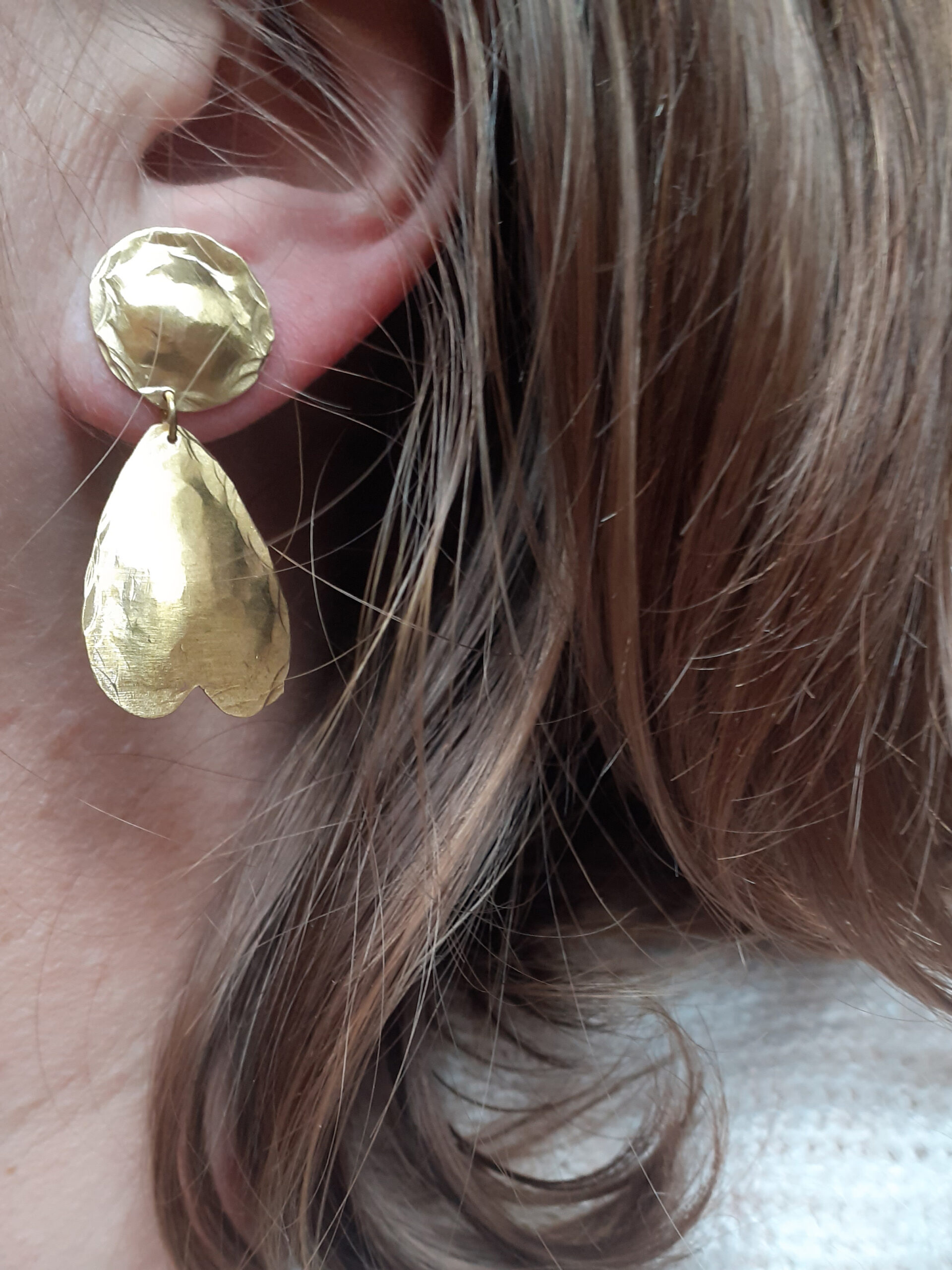 Ces petites boucles d’oreilles pendantes sont composées d’une partie ronde fixe et petit cœur retourné. Elles sont martelées et mise en forme à la main.